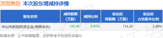 证券之星消息股票配资最新消息,9月18日顶固集创发布公告《顶固集创:关于首发前员工持股平台减持计划实施完成暨减持结果公告》,其股东中山市凯悦投资企业(有限合伙)于2025年8月7日至2025年9月17日间合计减持195.0万股,占公司目前总股本的0.9504%,变动期间该股股价上涨0.11%,截止9月17日收盘报9.03元。